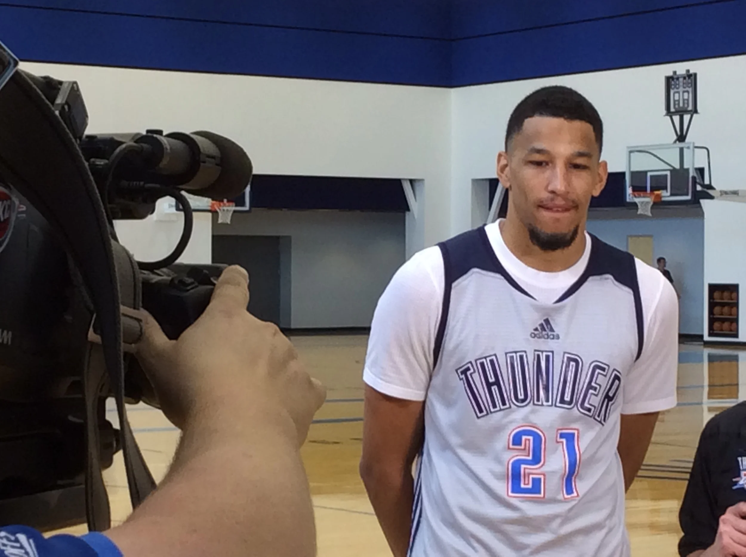 Thunder guard Andre Roberson about to be interviewed after Friday's shootaround. Photo By Randy Renner/InsideThunder.com